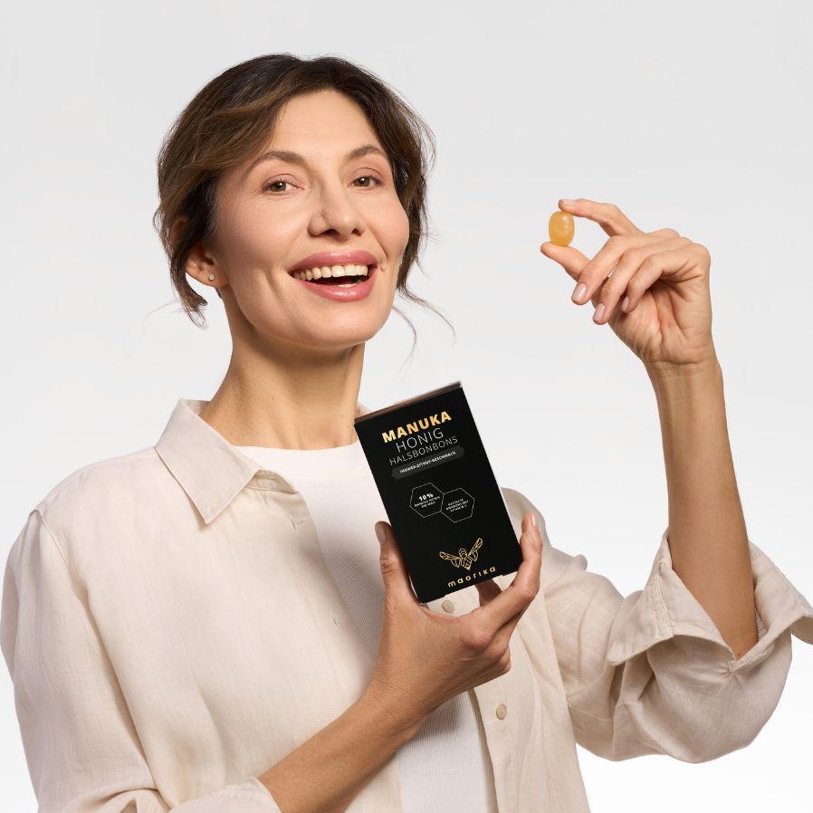 Hustenbonbons mit natürlichen Inhaltsstoffen wie Manuka Honig, Ingwer, Vitamin C und natürlichen Aromen können die Schleimhäute pflegen und das Wohlbefinden unterstützen. Wichtig ist die Qualität der Inhaltsstoffe und die Zertifizierung des Manuka Honigs.