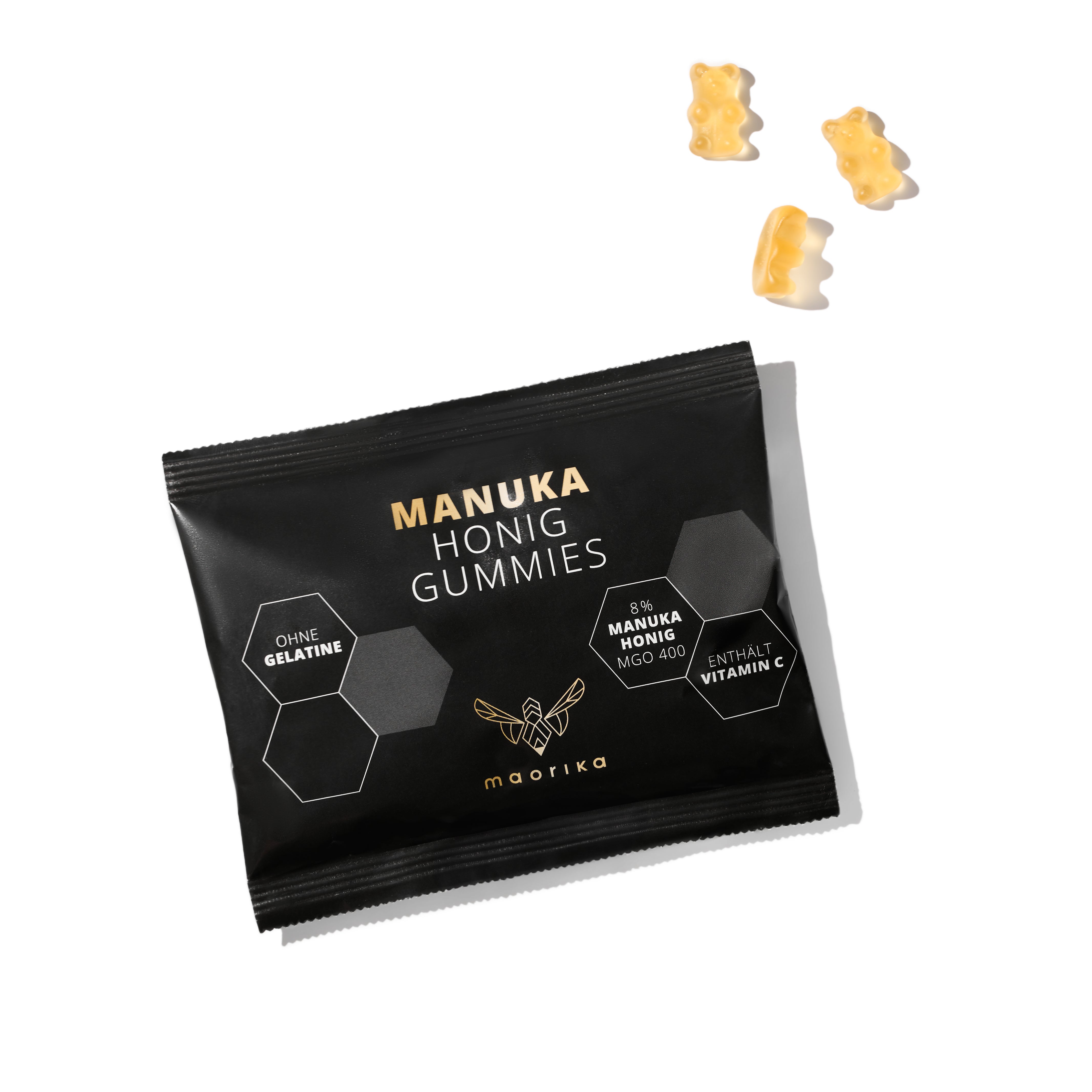 Entdecken Sie eine wohlschmeckende und praktische Möglichkeit, die besonderen Eigenschaften von echtem Manuka Honig zu genießen. Unsere maorika Manuka Gummies vereinen hochwertigen, zertifizierten Manuka Honig aus Neuseeland (MGO 400) mit wertvollem Vitamin C in einem soften, gelatinefreien Fruchtgummi. Sie sind eine angenehme Alternative für die ganze Familie, um sich den Tag auf bewusste Weise zu versüßen und dem Körper gleichzeitig etwas Gutes zu tun.
