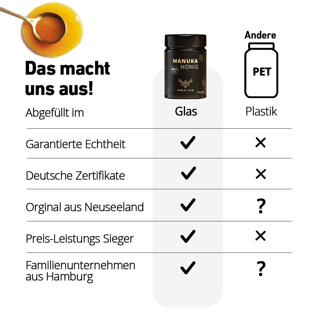 In einem Umfeld, wo über die Hälfte aller Manuka Honige nicht authentisch sind, setzen wir auf klare Transparenz mit deutschen Zertifikaten.